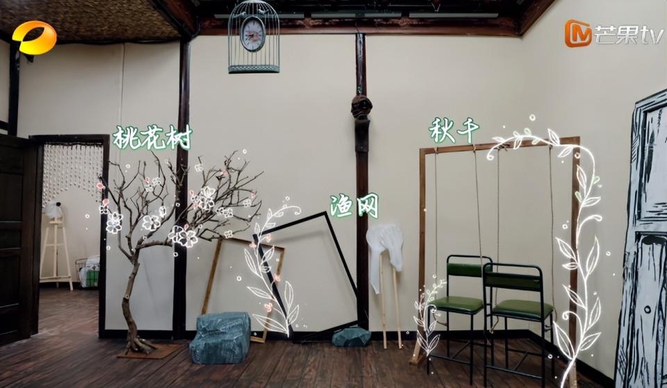 何炅一眼就看到了旁边的装饰物,就是演话剧的道具给搬过来的。
