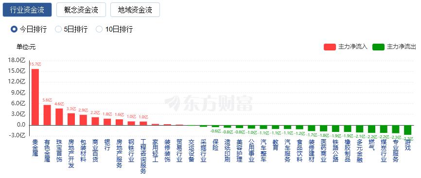 行业资金方面,截至收盘,贵金属、有色金属、珠宝首饰等净流入排名靠前,其中贵金属净流入15.66亿。