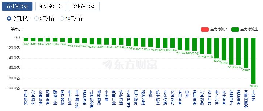 净流出方面,半导体、互联网服务、通信设备等净流出排名靠前,其中半导体净流出90.65亿元。