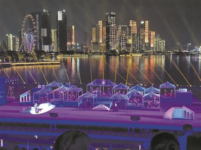 欢乐剧场的独特环境成为本次演出最引人注目的亮点。剧场创新采用“陆域看台+水域舞台”的双结构布局,拥有全国最大的户外水上舞台。其核心设计理念“艺术+生态”在此次演出中得以充分体现:舞台摒弃传统LED屏幕,将浩瀚海景、城市天际线以及“湾区之光”摩天轮融入背景,形成独一无二的开放式“海景剧场”,每一束自然光、每一阵微风都成为演出的一部分,营造出灵动的现场体验。
